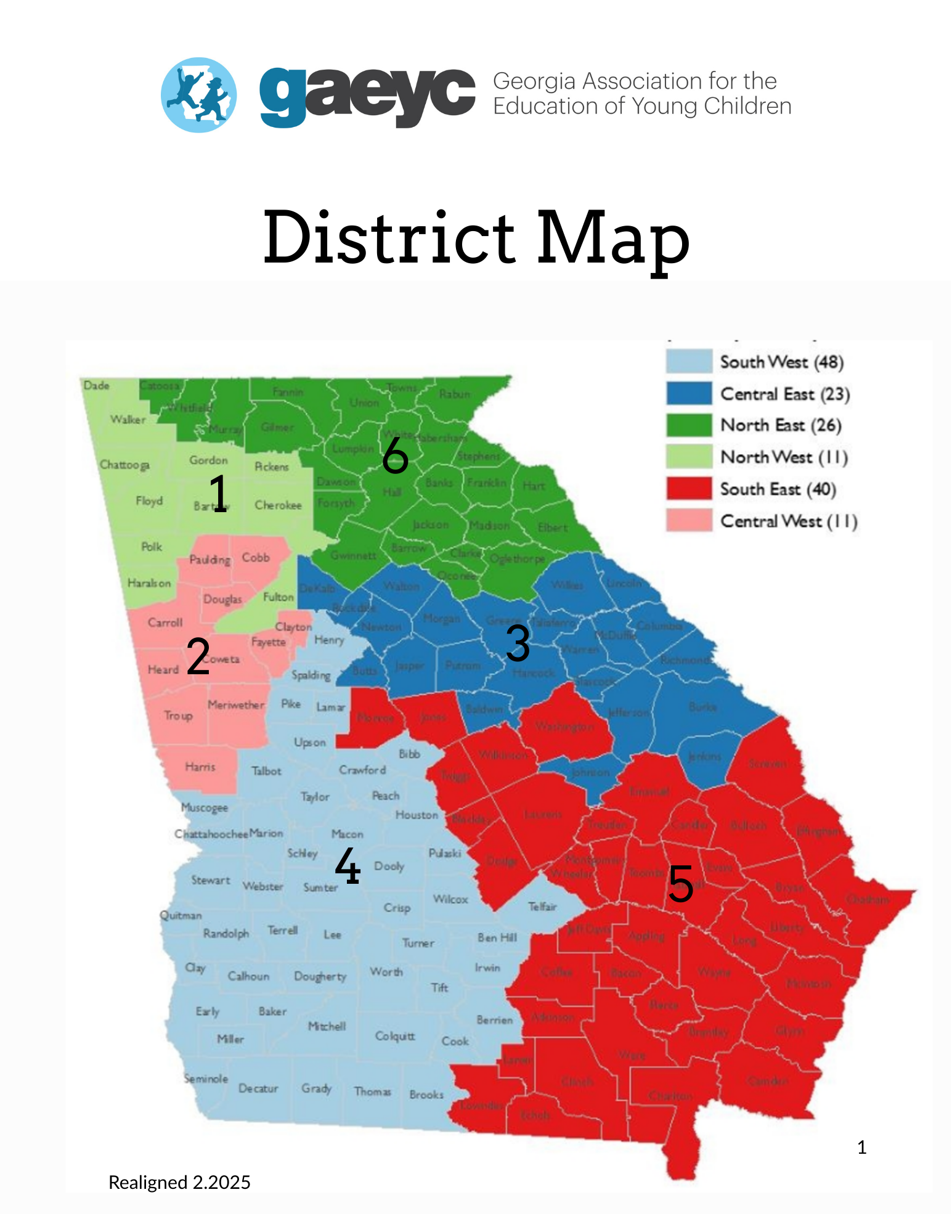 GAEYC is divided into 6 geographic districts (Newly restructured in February 2025). Each district has one to two representatives on the GAEYC Board, whose responsibility is to share news from GAEYC with the early childhood community, and to share issues and updates from the district with GAEYC.